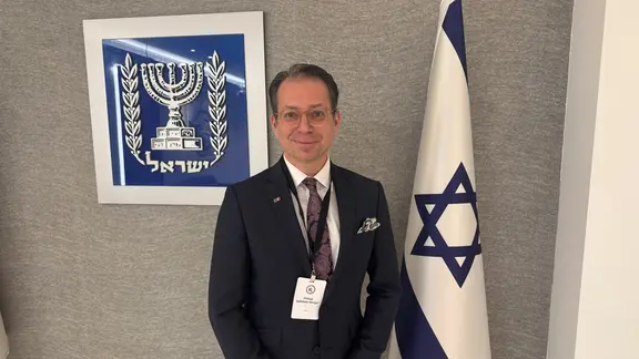 Historiker Philipp Salamon-Menger neben einer israelischen Flagge.